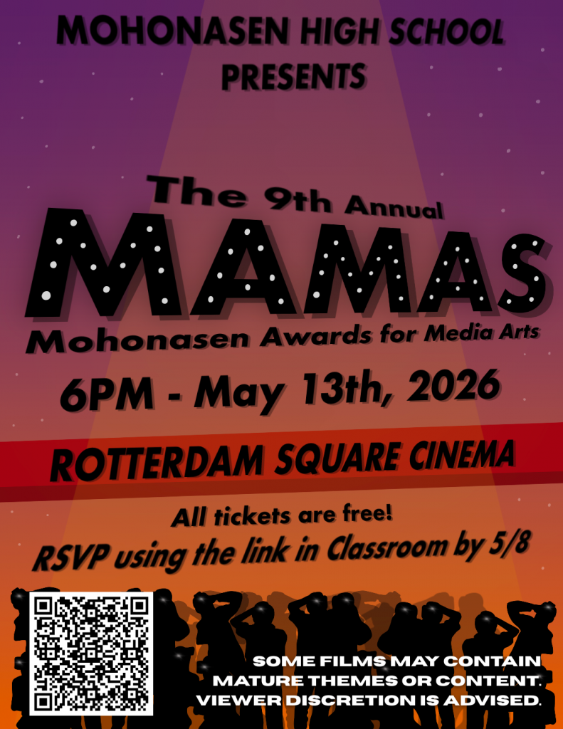 The 9th Annual Mohonasen Awards for Media Arts (MAMAs) will be held at 6 p.m. on Wednesday, May 13, at the Rotterdam Square Cinema. The MAMAs is an Oscar-style awards show that celebrates the achievements of media arts students and showcases the creativity they’ve demonstrated throughout the school year.